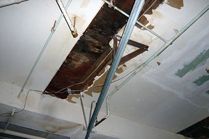- WARNING: Water stains or water damage on ceilings located below decks require immediate inspections to locate source of leak, structural damage, and mold contamination.