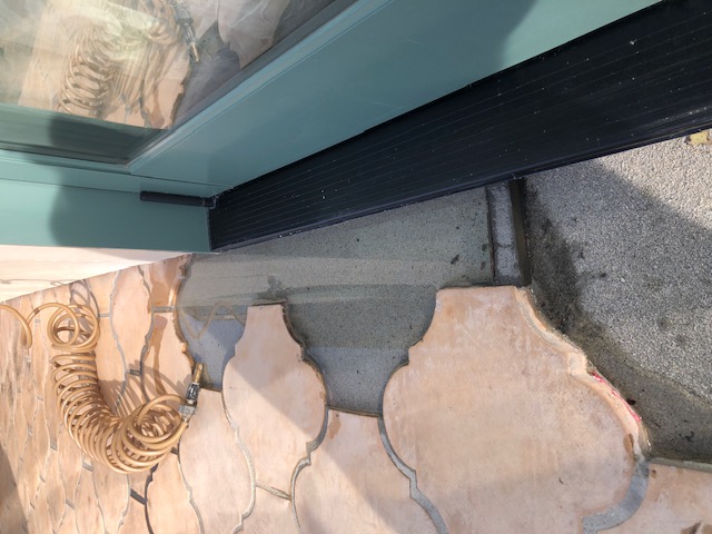 • Tile deck leaks at patio door threshold creating interior water damage